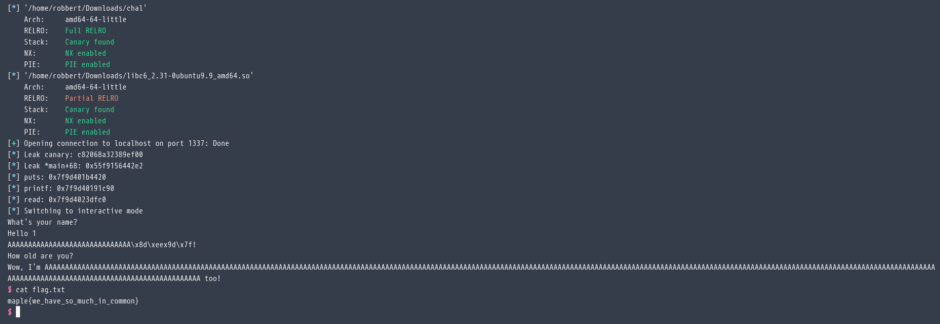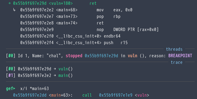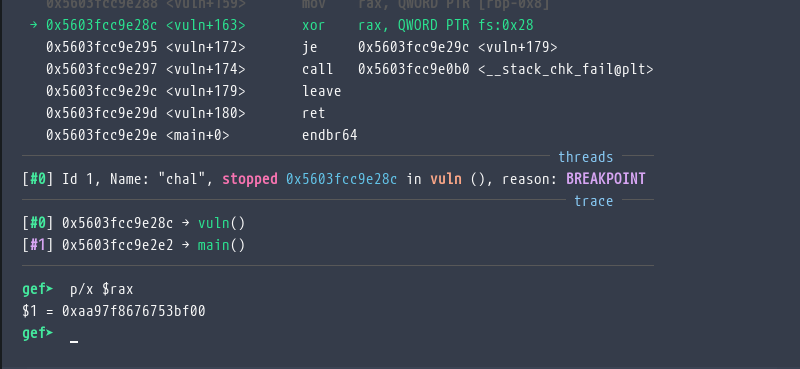 Giờ có được canary rồi, ghi đè saved rip để đi đến đâu? Binary này bật PIE nên ta cần leak thêm địa chỉ của hàm nào đó trong binary. Mình nghĩ khả dĩ nhất là địa chỉ trả về của vuln vì nó cũng ở trong stack (ngay sau canary).