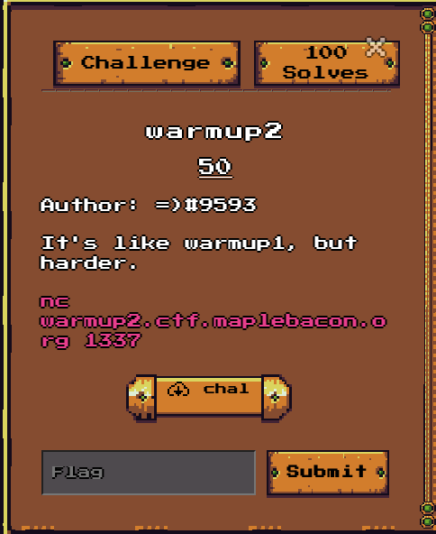 p=remote("warmup2.ctf.maplebacon.org",1337)