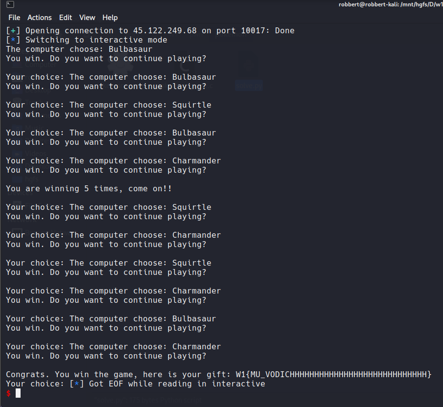 Bài này dính lỗi ở line 51, dùng hàm `strstr` thay vì hàm `strcmp`. Hàm `strstr` chỉ kiểm tra `pokemonss[computer]` có ở trong `choice` hay không.